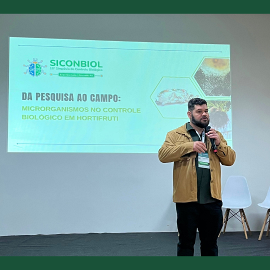 Outro destaque foi a palestra ministrada por nosso pesquisador Dr. Maicon Toldi, que apresentou soluções microbiológicas para o manejo de pragas e doenças em hortifrúti, ressaltando a importância da conexão entre laboratório e campo, levando o conhecimento de bancada para as lavouras.