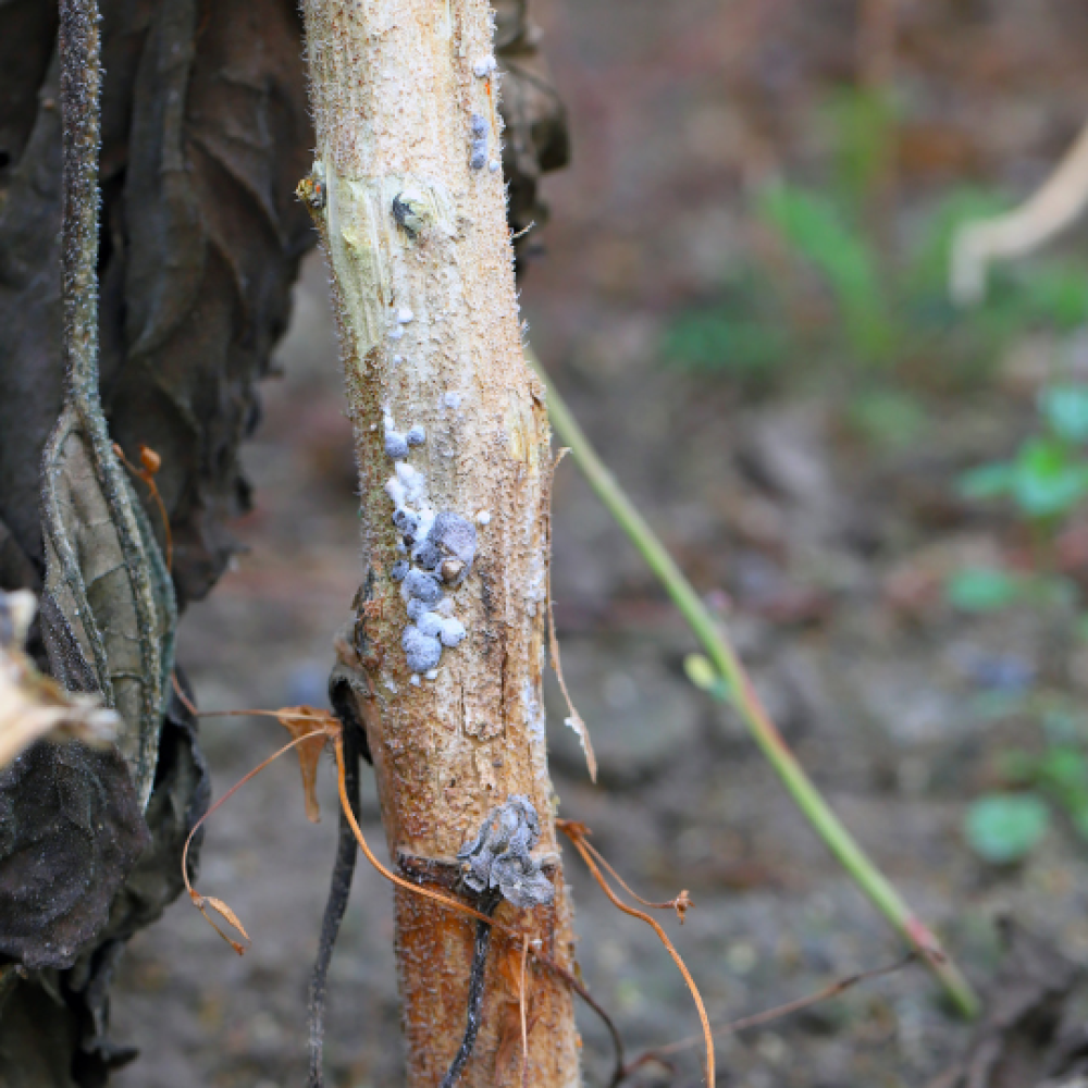 A doença Mofo Branco, conhecida também como Podridão Branca, é causada pelo fungo Sclerotinia sclerotiorum. Esse patógeno afeta mais de 400 espécies de plantas, incluindo culturas importantes como soja, fumo, algodão, batata, tomate e feijão.